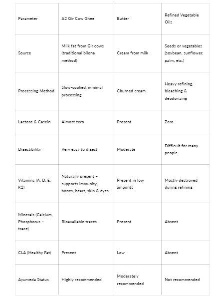 Unlike refined oils, ghee supports the gut lining and improves nutrient absorption, making it especially beneficial for people with weak digestion or those recovering from illness.