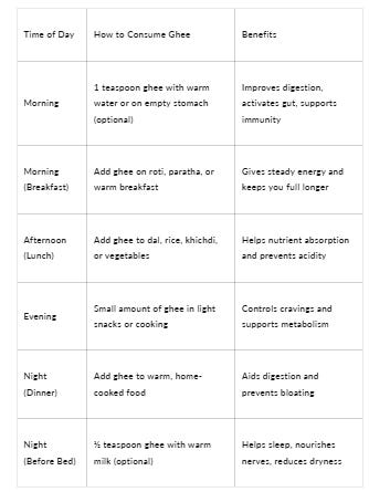 For most adults, 1–2 teaspoons of ghee per day is ideal. It can be consumed with meals, added to warm food, or taken in the morning with warm water under guidance.